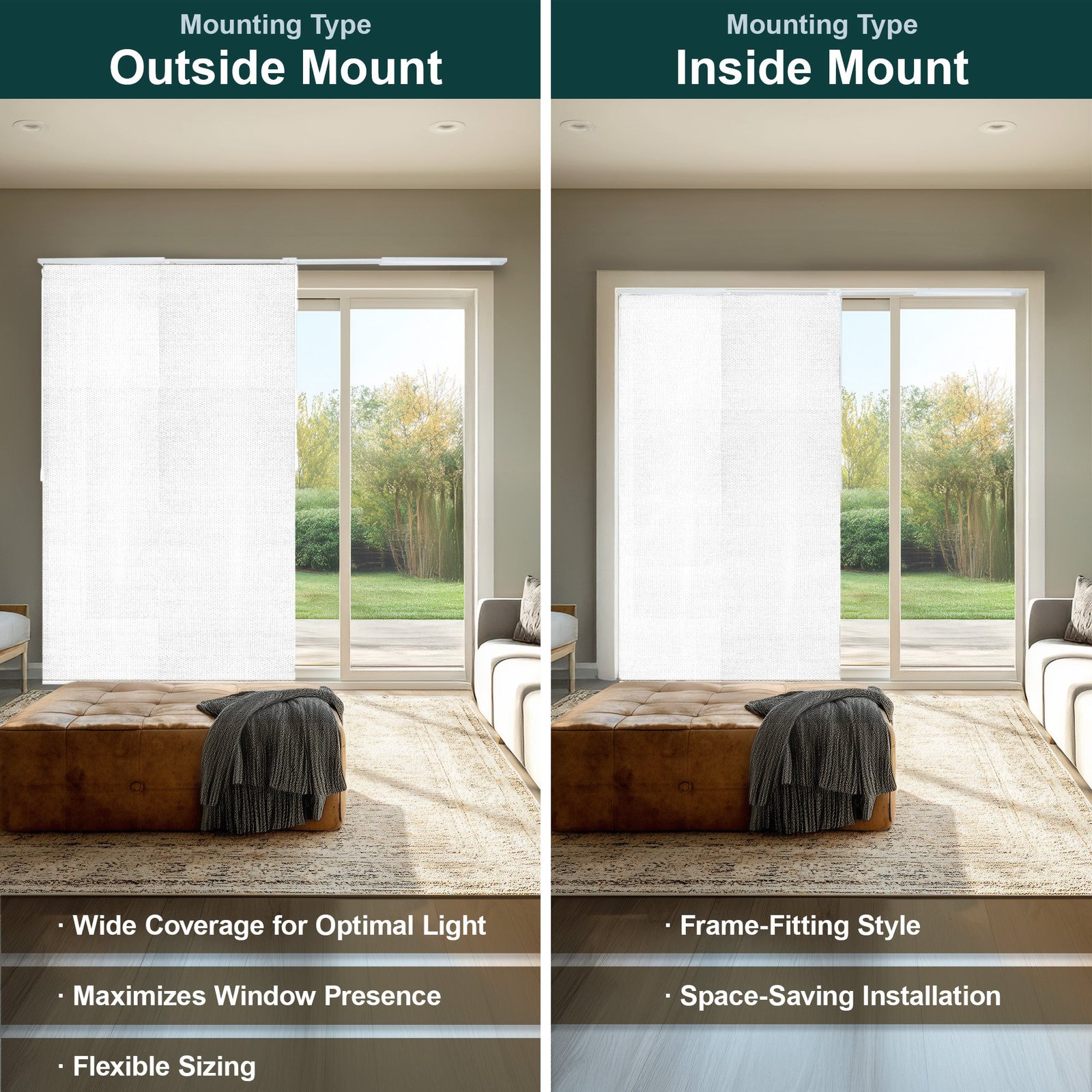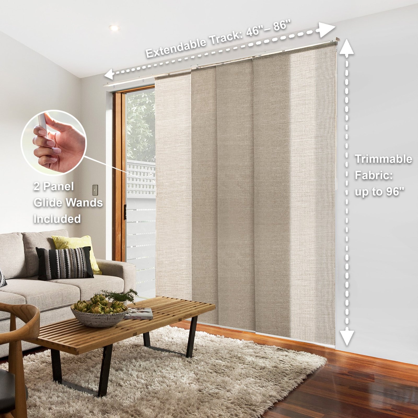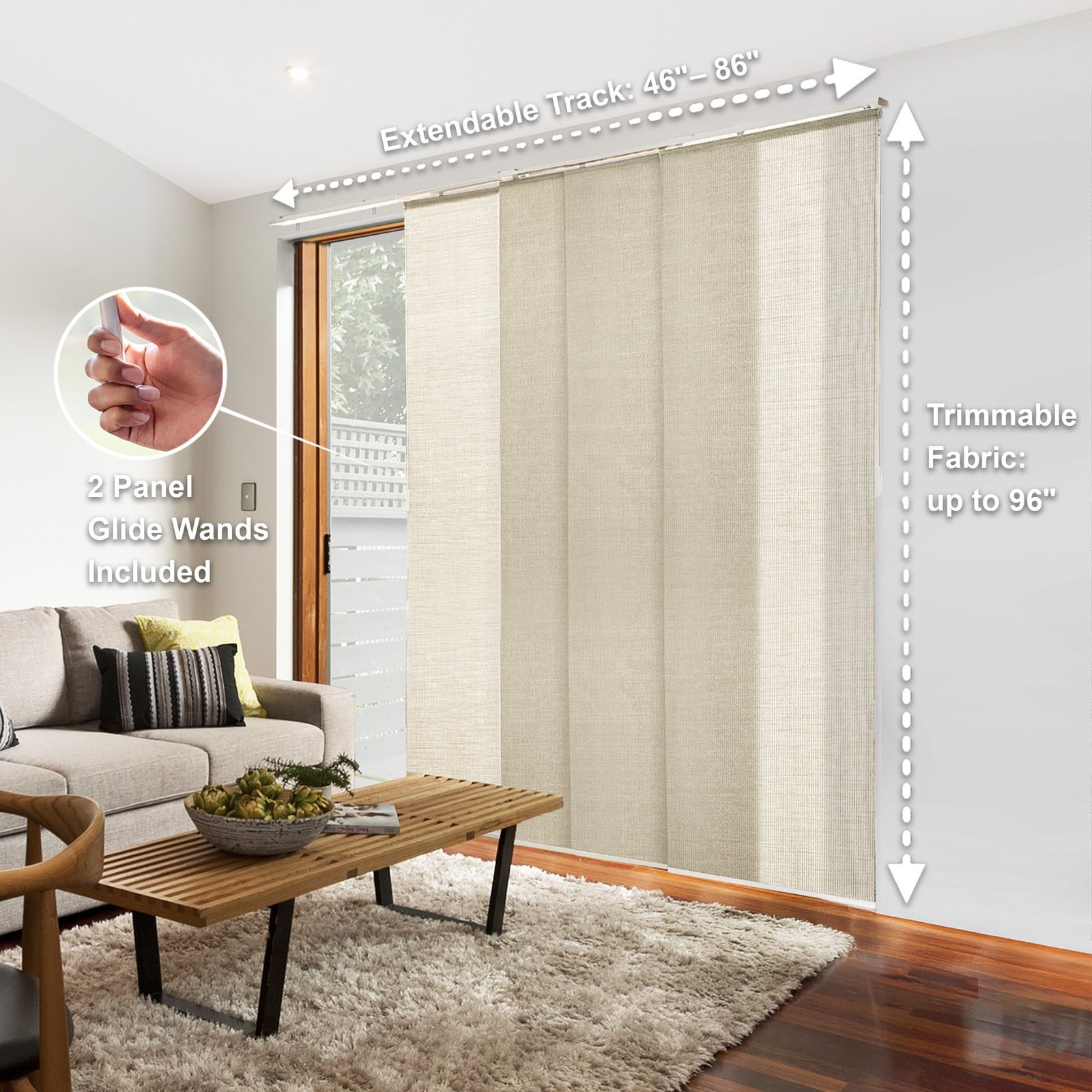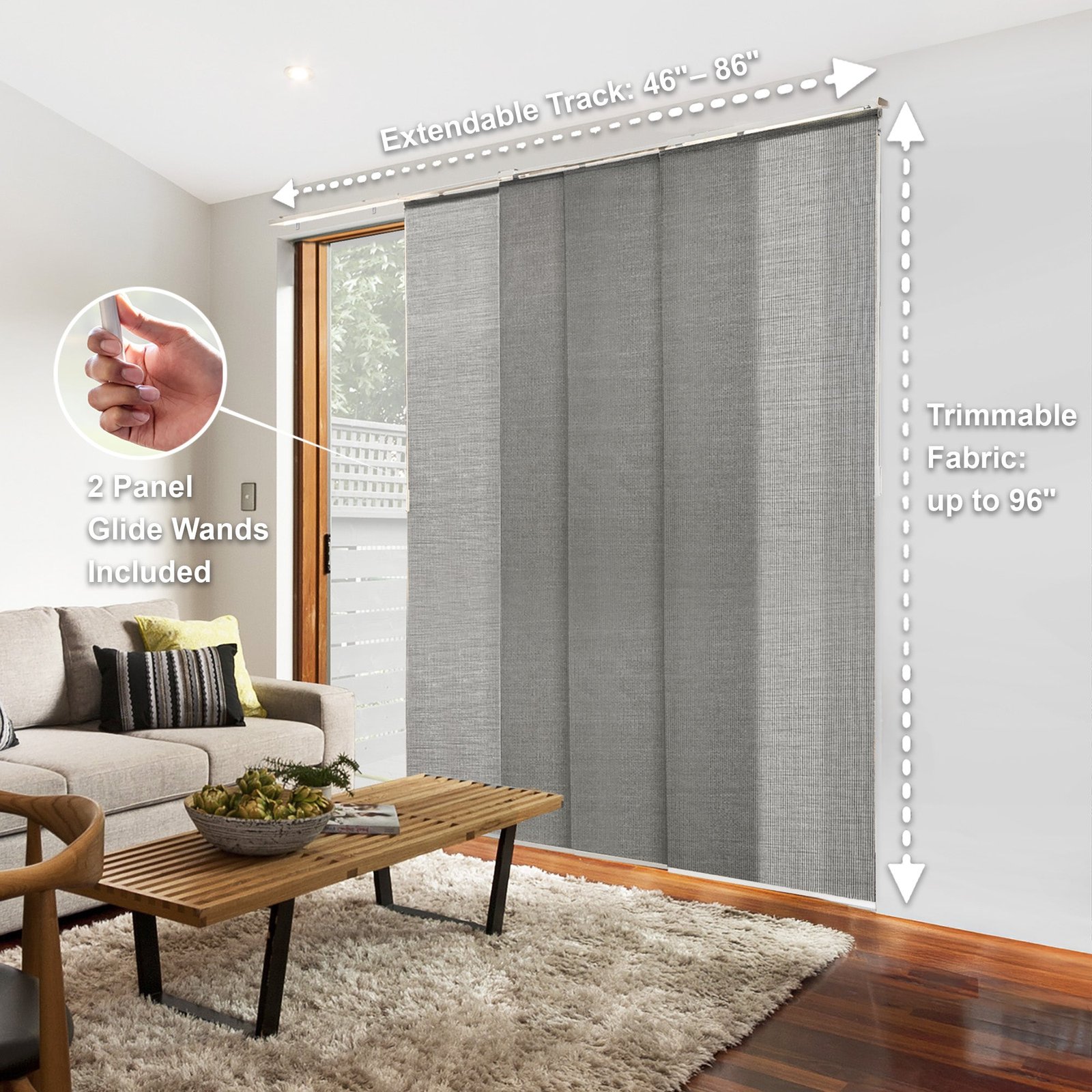 The fabric panels are trimmable, allowing you to customize the height for a perfect fit. The 4-rail headrail adjusts from 46′ to 86′ wide, with dual wands for smooth operation. Choose left or right opening, and mount to either the wall or ceiling. Finished with white aluminum top and bottom rails.