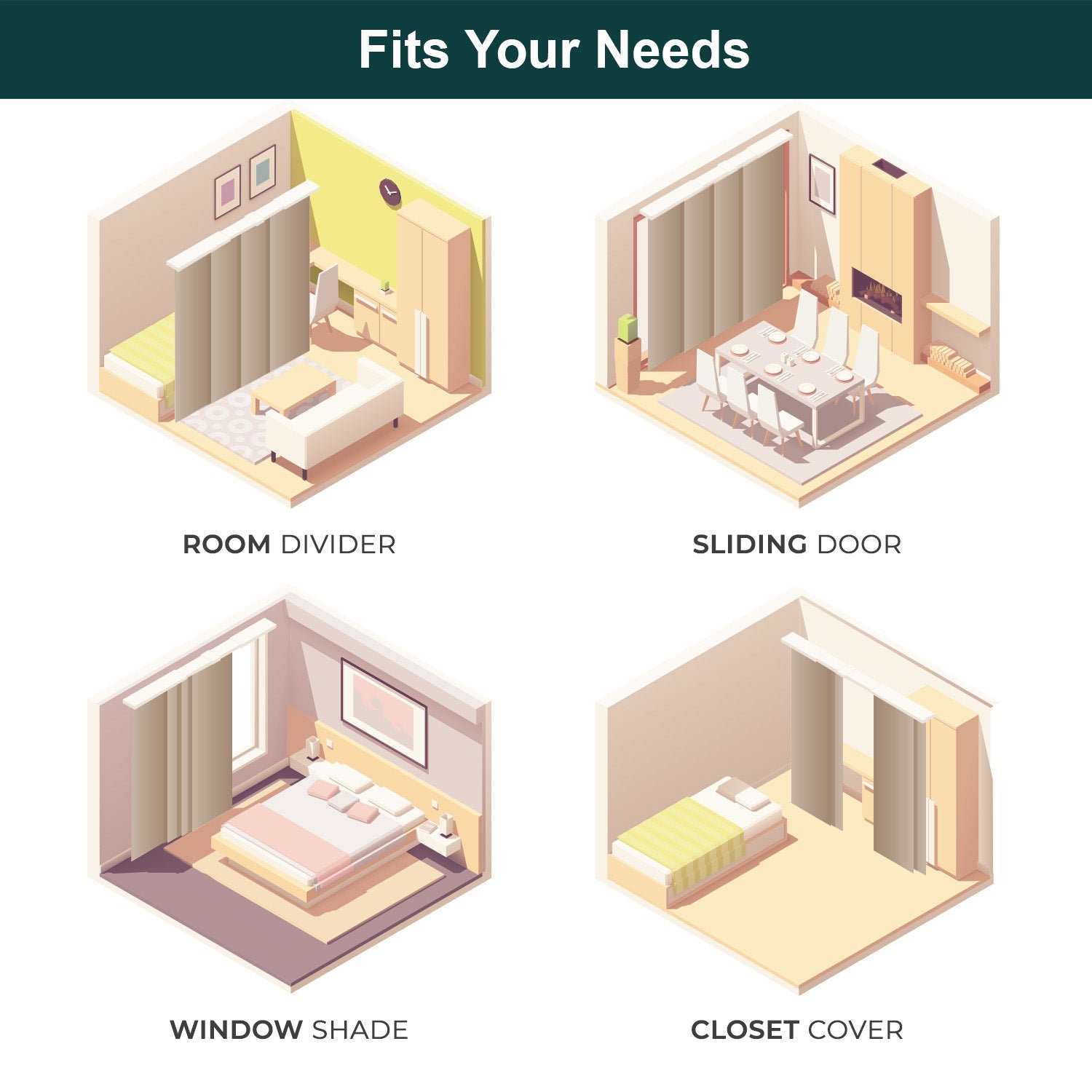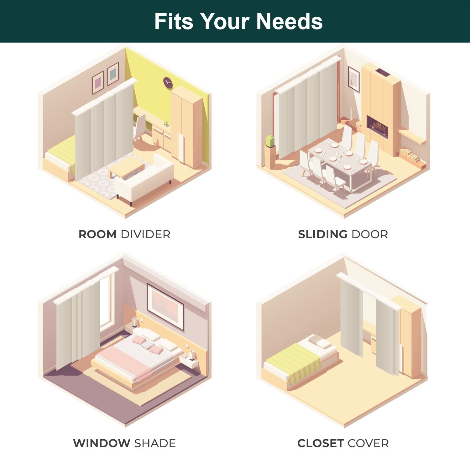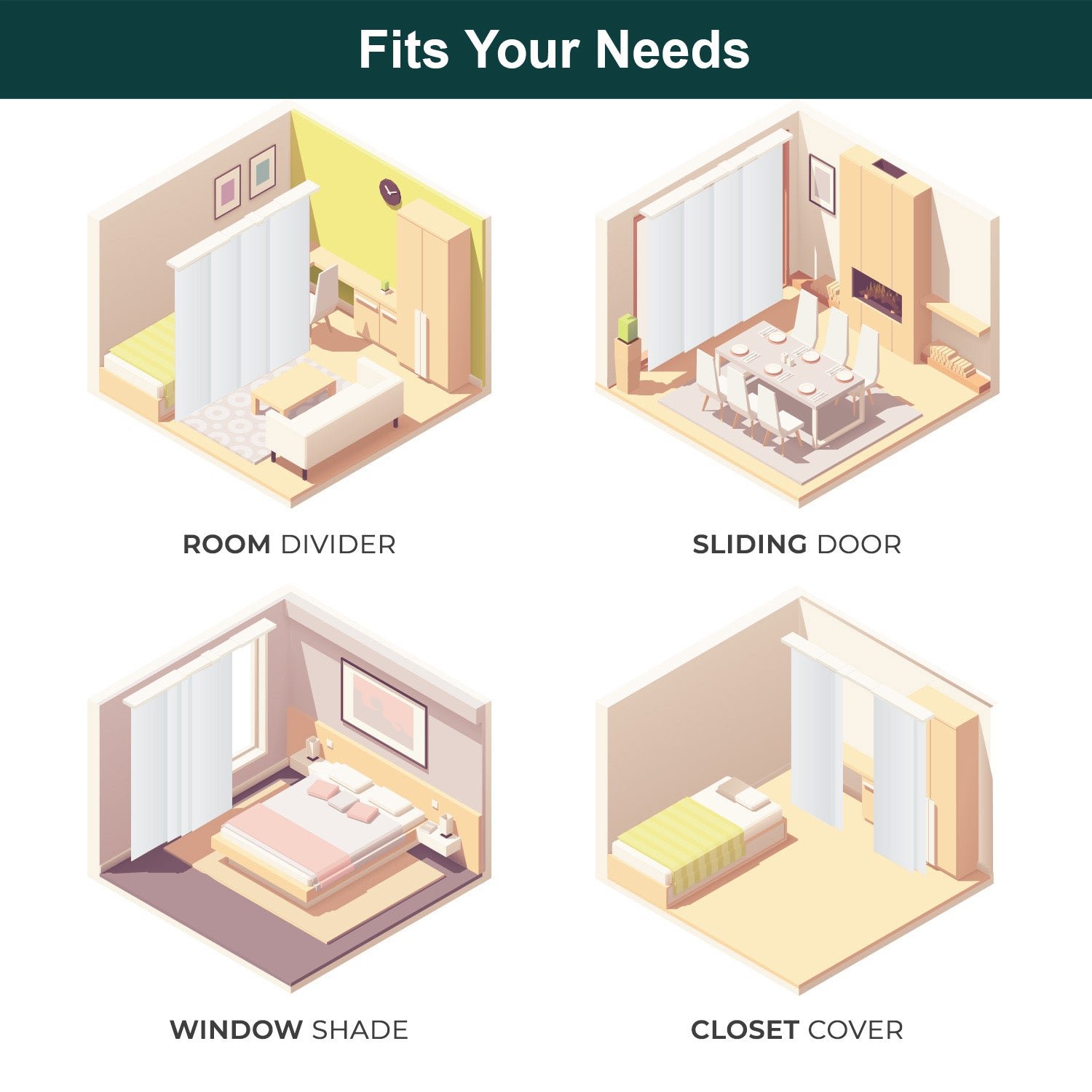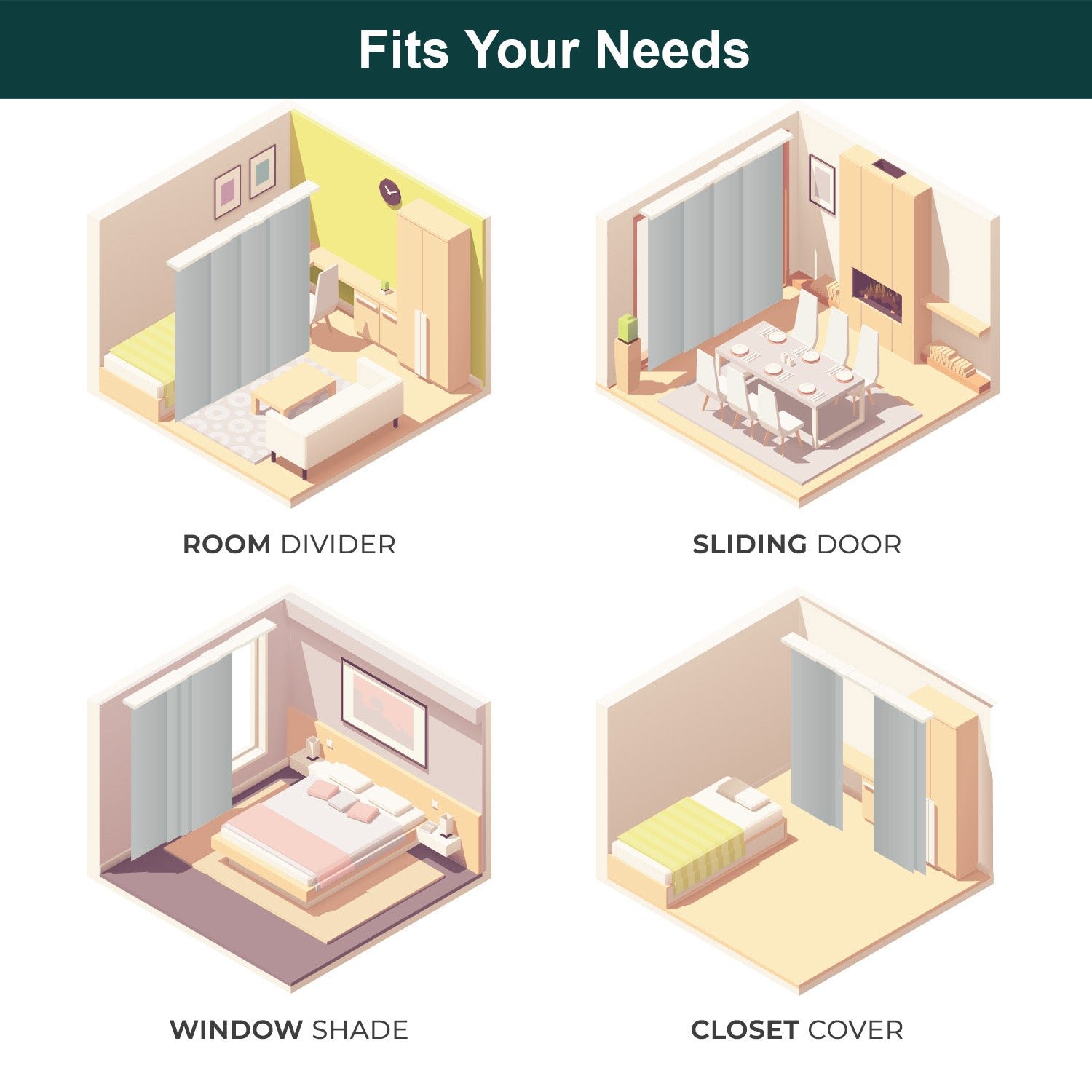 The fabric panels are trimmable, allowing you to customize the height for a perfect fit. The 4-rail headrail adjusts from 46′ to 86′ wide, with dual wands for smooth operation. Choose left or right opening, and mount to either the wall or ceiling. Finished with white aluminum top and bottom rails.