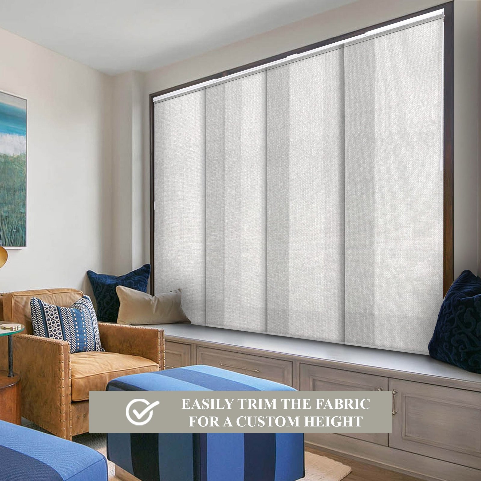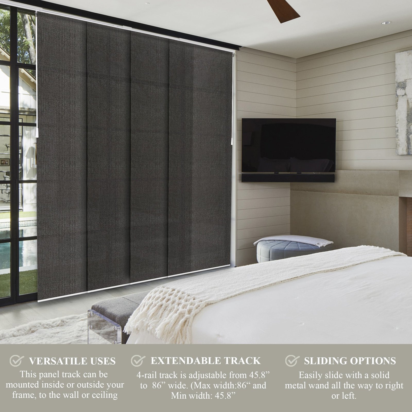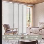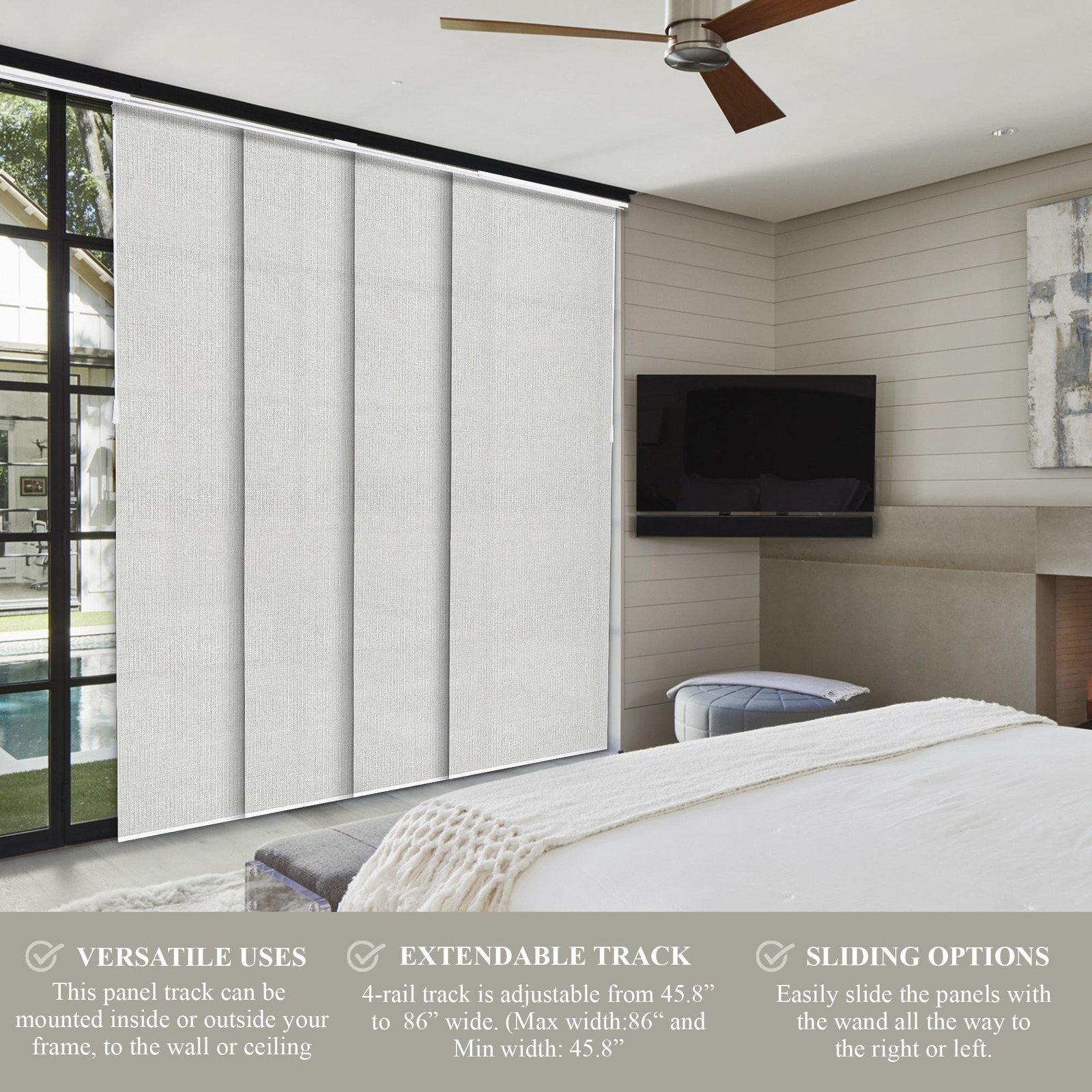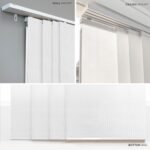 Each panel is trimmable to fit your desired length, while the 4-rail track system adjusts between 46′ and 86′ wide. Glide panels smoothly with dual wands, and choose whether to open from the left or right. The white aluminum headrail and bottom rails deliver a sleek, built-in feel. Designed for versatility, these blinds can be installed on the wall or ceiling and used as a window treatment or room divider.