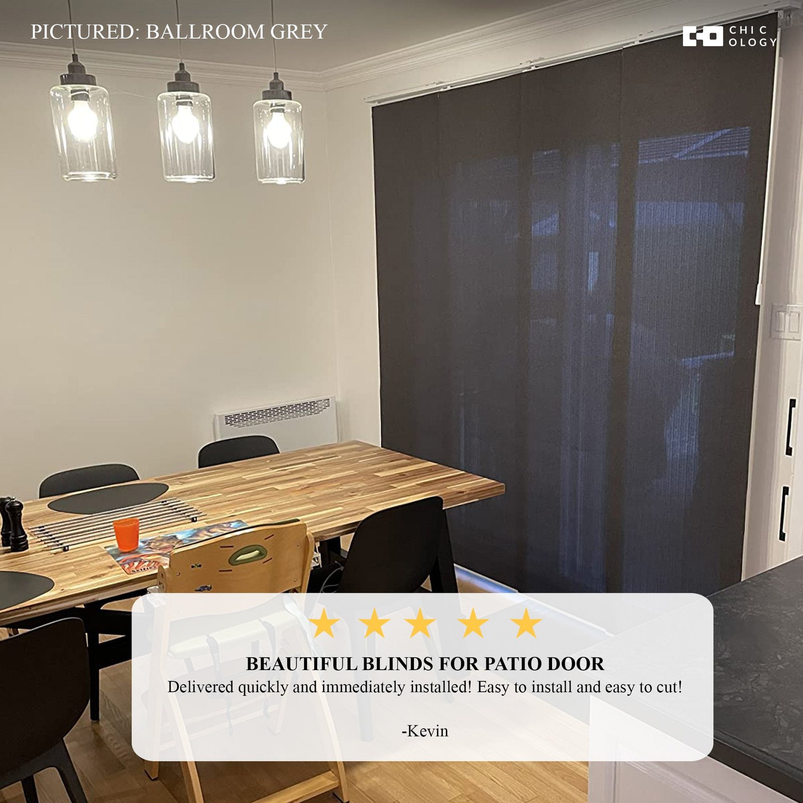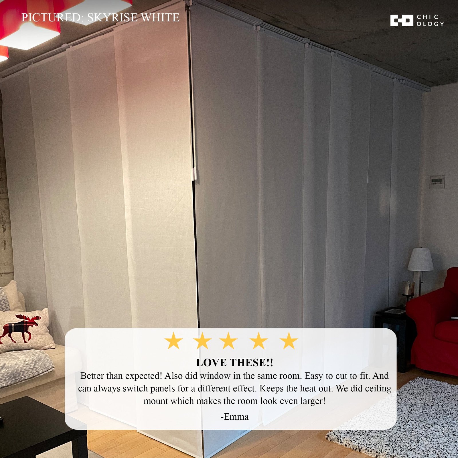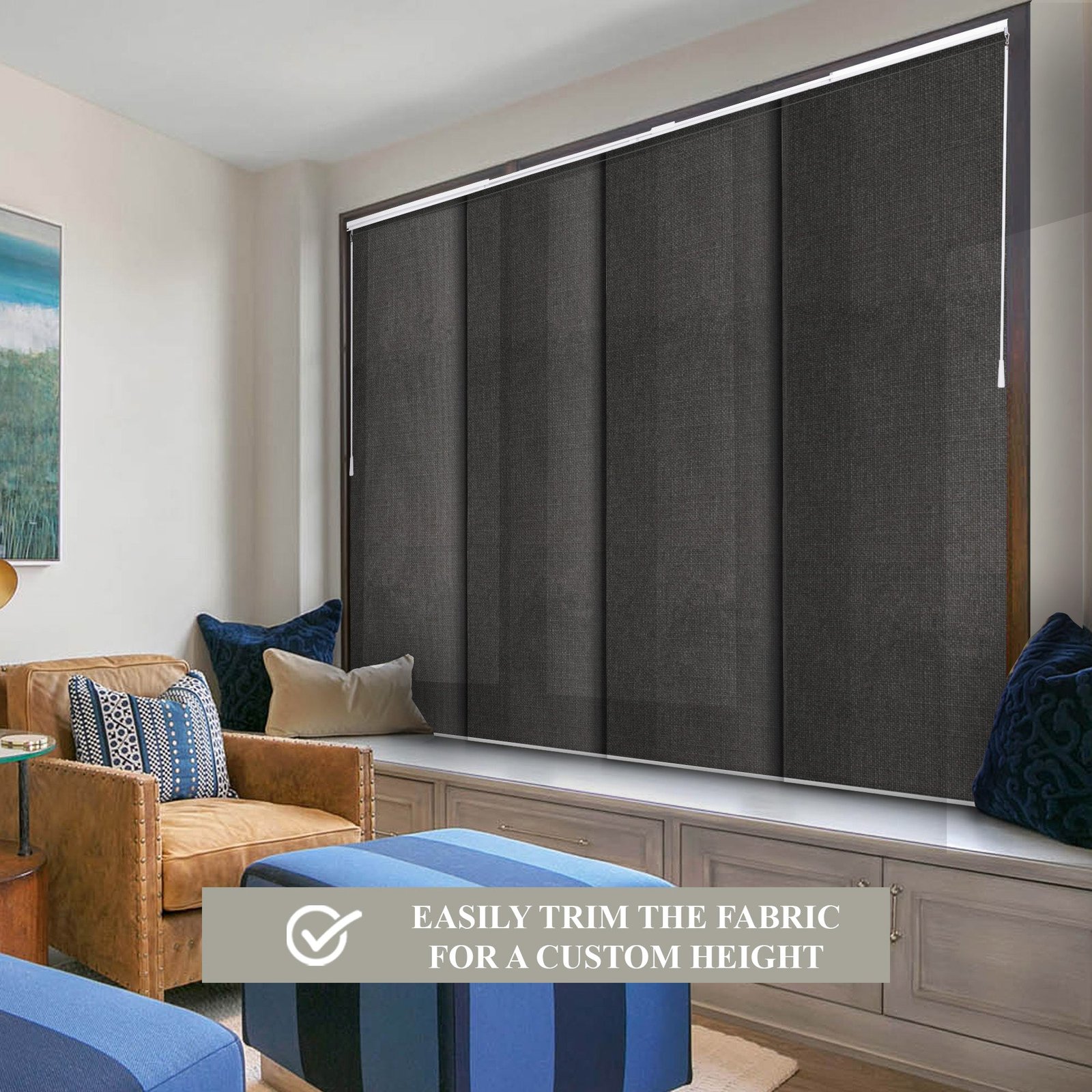 Each panel is trimmable to fit your desired length, while the 4-rail track system adjusts between 46′ and 86′ wide. Glide panels smoothly with dual wands, and choose whether to open from the left or right. The white aluminum headrail and bottom rails deliver a sleek, built-in feel. Designed for versatility, these blinds can be installed on the wall or ceiling and used as a window treatment or room divider.
