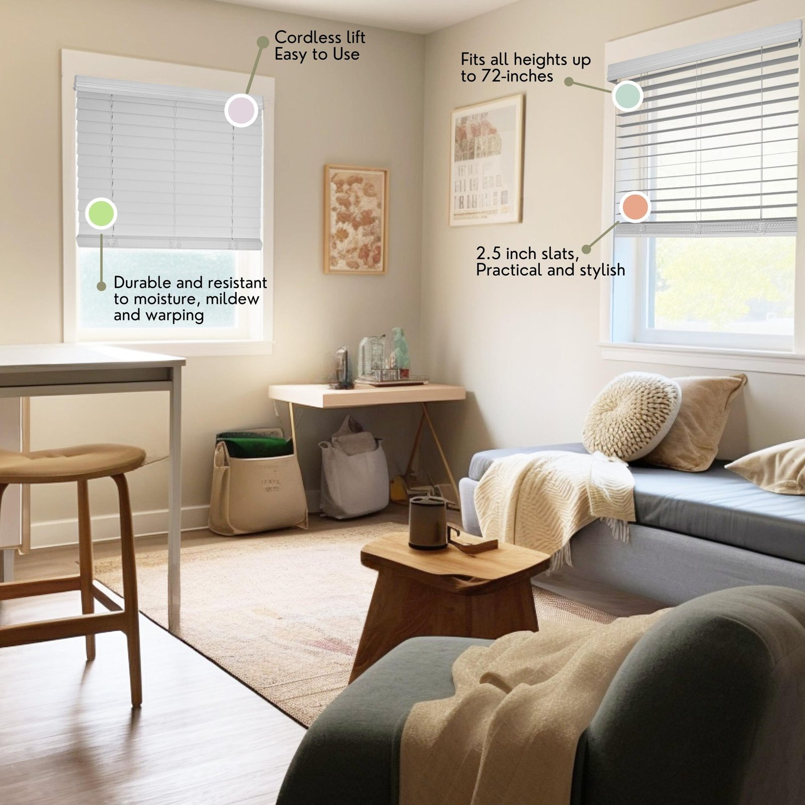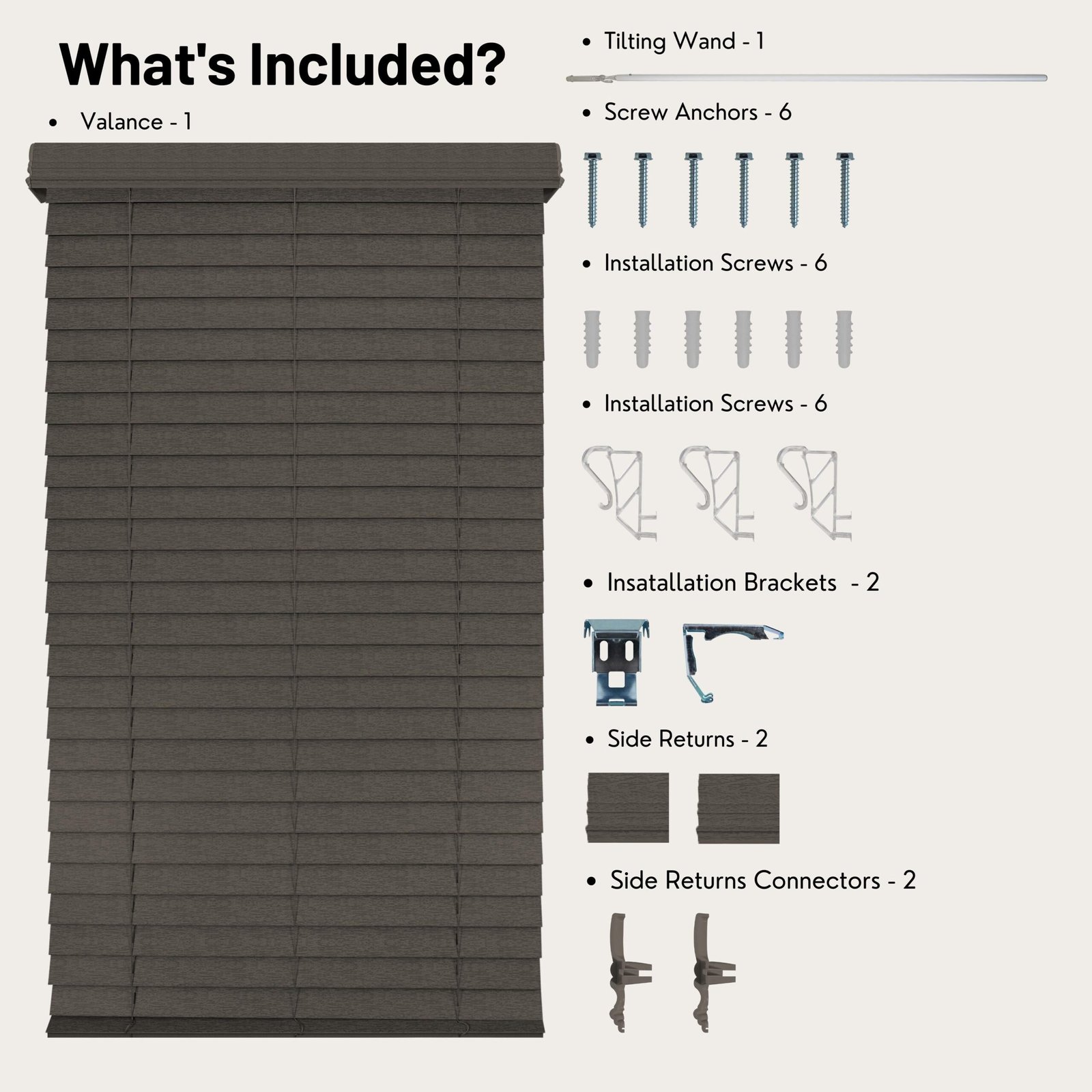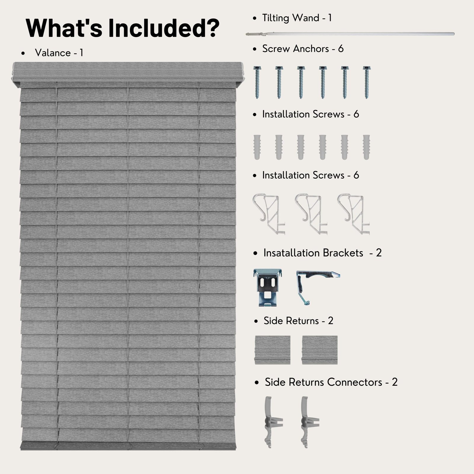These faux wood blinds feature a textured, wood grain design for a sophisticated look. With 2.5 inch slats, they provide excellent room darkening capabilities. Plus, the durable PVC material is warp, fade, and chip resistant for long-lasting use. Enjoy the added convenience of cordless lift, making them safe for children and pets in the home. Comes with a matching flat valance for a sleek finish.