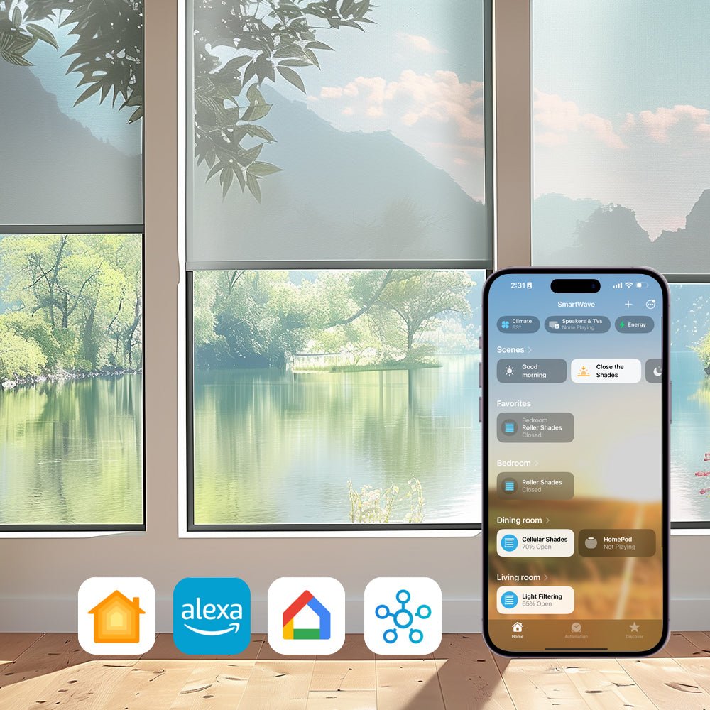 SmartWave smart shades are seamlessly compatible with popular smart home systems such as Apple Home .Amazon Alexa. Google Home. and SmartThings.